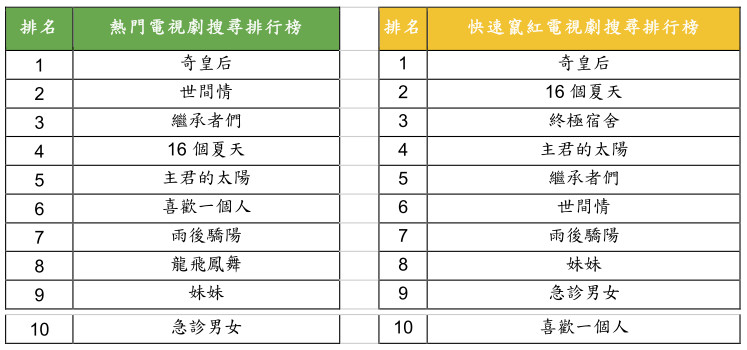 今年在台灣電視劇收視方面,由台灣在地電視劇力抗「韓」風,即使在韓國榮登收視率寶座的「奇皇后」強佔年度「熱門電視劇搜尋排行榜」及「竄紅電視劇搜尋排行榜」第一名,台灣在地電視劇則憑藉演技實力與創新劇情,推出叫好又叫座的電視劇作品,因而「世間情」、「16 個夏天」、「雨後驕陽」、「龍飛鳳舞」、「妹妹」、「終極宿舍」等劇皆廣受民眾好評,受歡迎程度之高讓它利順利進入前十名!有趣的是,以往在台灣熱門電視劇搜尋榜幾乎都是日、韓劇的天下,但今年榜單顯示日劇已逐漸退燒,台劇與韓劇勢均力敵。