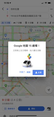 同時還推出限時歡慶主題汽車圖示,選擇好導航的路線後,點選右下角的「汽車」圖示,就可加入生日禮車的慶祝活動,在地圖上導航的會是一輛綁著生日氣球的禮車。