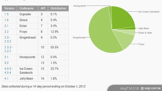 2012 年是 Google Android 市場爆破性發展的一年,不但世值順利超越微軟,Android 也超越 iOS 成為大平台,而 Google 也在今年 6 月 Google I/O 大會上發佈了最新 Android 4.1 Jelly Bean 作業系統,結果是大受好評。不過腳步邁得太快,舊款手機升級速度無法跟上,導致 Android 4.0 Ice Cream Sandwich 雖花了 1 整年時間推廣,仍未得到全面普及,據 Google 今年 10 月最新公佈的 Android 平台分析調查資料顯示,Android 4.0 Ice Cream Sandwich 作業系統市佔率為 23.7%,雖在市場份額方面呈現上漲趨勢,但 依舊遠不及佔有率高達 55.8% 的 Android 2.3 Gingerbread ,而最新的 Android 4.1 Jelly Bean 作業系統僅佔有 1.8% 的市場份額。雖成長緩慢,但從最近發布的數據資料來看,趨勢已經很明確,未來 Android 4.1 Jelly Bean 作業系統,會受到越來越多使用者的親睞,而高居第一的 Android 2.3 Gingerbread 系統 ,則會逐漸衰退。