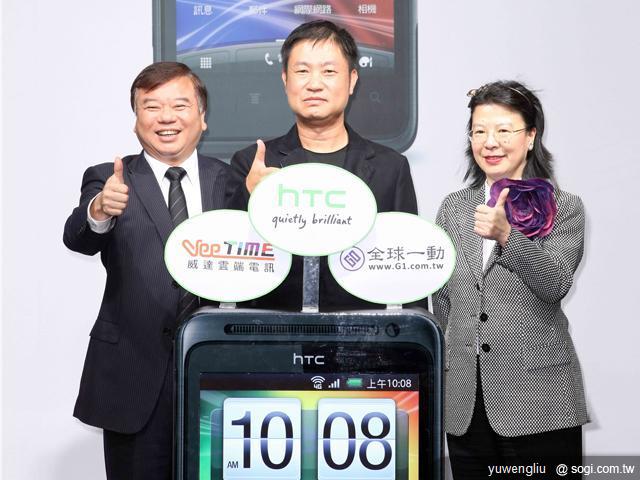▲HTC在台發表首款WiMAX智慧型手機HTC EVO Design。嘉賓合影,左起威達雲端電訊董事長 賴富源先生、HTC台灣區總經理 朱光啟先生、全球一動董事長 何薇玲女士。
