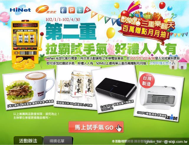 HiNet 光世代非固定制 2013 年開春首波「歡樂點三重樂翻天,百萬贈點月月抽」優惠活動,凡新申請、升速、續約 HiNet 光世代非固定制的客戶皆可參加。