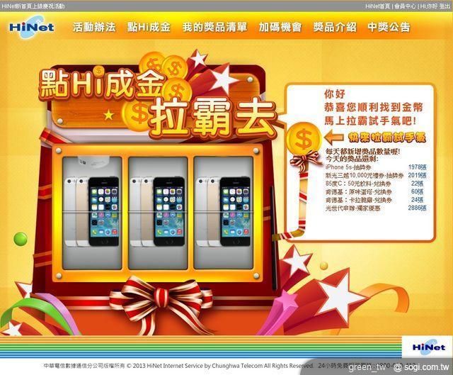 詳情請上「點 Hi 成金~拉霸」活動網址:http://www.hinet.net/event/2013/