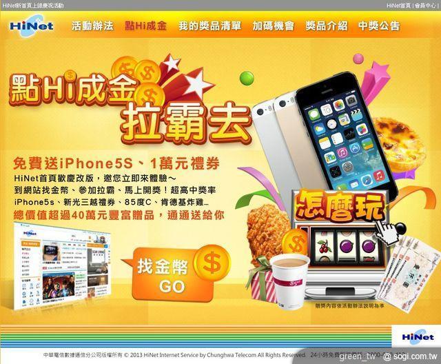 HiNet 首頁於 11 月全新改版上路,領先台灣其他入口網站,針對平板裝置可自動排版 RWD(Responsive Web Design),讓使用不同螢幕大小的網友更方便閱讀網站資訊。同時,為歡迎使用者體驗全新頁面設計及便捷功能,推出「點 Hi 成金~拉霸」活動。即日起至 12 月 24 日,只要到 HiNet 首頁找金幣連結,就可以進行拉霸抽獎,HiNet 將送出總價值超過 40 萬元的豐富禮品,包括智慧型手機 iPhone5s、新光三越一萬元禮券,和近萬張 85 度 C 飲料、肯德基卡拉脆雞、原味蛋塔兌換券,越早參加中獎機會越高。