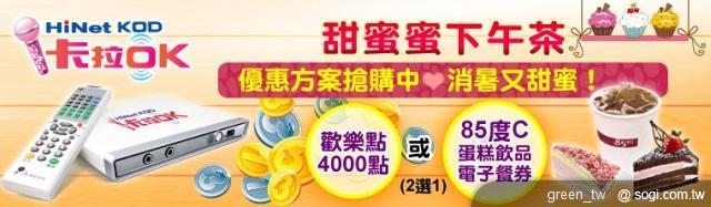 HiNet KOD 提供獨家定調功能與專利練唱工具,能自動調整歌曲曲調,啟用個人化練唱模式,詮釋經典歌曲輕鬆到位!為回饋續約老客戶,HiNet KOD 推出超值優惠方案。即日起,續約就送 85 度 C 下午茶組電子餐券或歡樂點 6000 點 (好禮二選一),活動將延續至 102/12/31 止。