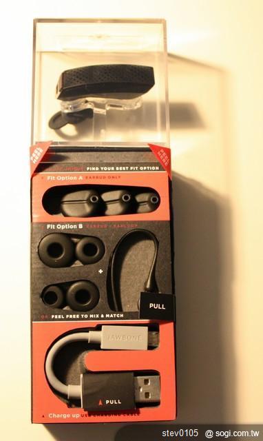 這包裝還真是精美, 打開來看發現廠商誠意十足, 配件之齊備周全的還真沒話說, 不但兩種各種尺寸的耳套都給了,還加耳掛勾讓用戶自行搭配組合, 除了尺寸迷你但是彈性十足的USB充電線以外,最扯的是連車充都附了, 不過沒有附變壓器是小小的遺憾, 很想看看變壓器在這款JAWBONE會是設計成怎麼樣.