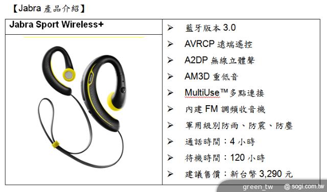 廣受運動愛好者歡迎的 Jabra Sport 系列推出升級版產品 Jabra Sport Wireless+,擁有軍用級防汗、防震功能,消費者能夠在任何天候狀況下盡情運動;音質絕佳的 Jabra Sport Wireless+ 高低音分明、可細膩詮釋每一首音樂,讓消費者在動感的音符律動中暢快享受運動樂趣。