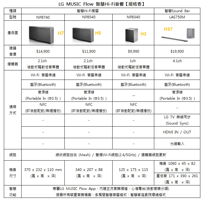 LG MUSIC Flow 智慧 Hi-Fi 音響系列建議售價