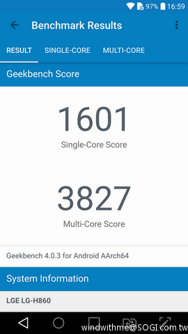 Geekbench 3 => 單核心分數為1601,四核心分數為3827
