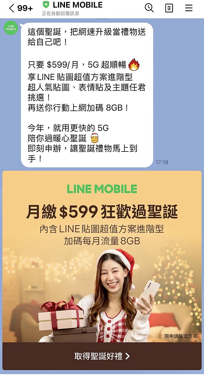 收到LINE訊息看到LINE MOBILE 5G方案有加碼