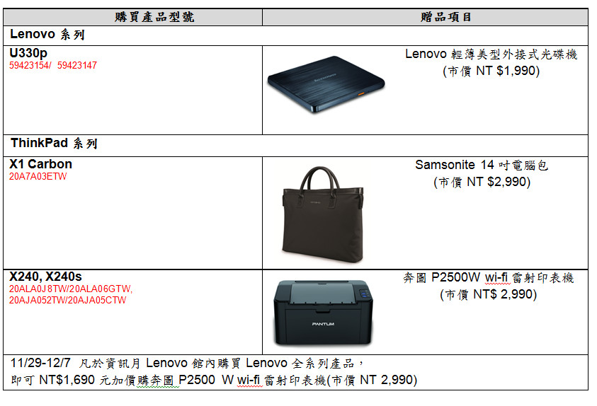 軍規檢驗認證!強悍 ThinkPad X240、X240s 系列:以輕薄被受矚目的 X 系列筆電,機身最厚處不到 1.8cm,以碳纖維材質打造超輕、超耐雙重功效!創新籠型護框技術為機殼增加額外地強度與堅固度,八項軍事規格測試陪你走過各種水深火熱。於 2014 年資訊月購買即贈送奔圖 P2500W Wi-Fi 雷射印表機 (市值 NT$ 2,990)。