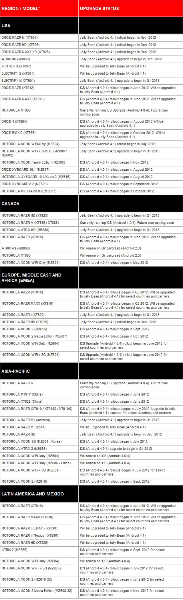 摩托羅拉官方表示將會與 Google 以及其他運營商合作為用戶帶來更好的設備體驗。而 Google 則表示將會在選定的國家和移動運營商中更新 MOTOROLA RAZR XT910 和 MOTOROLA RAZR MAXX HD,但並未透露具體的國家、運營商以及更新時間的相關資訊。以下是全球各地摩托羅拉機型的系統升級計畫的詳細情況: