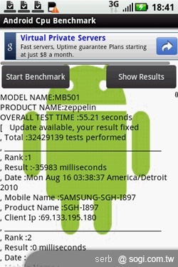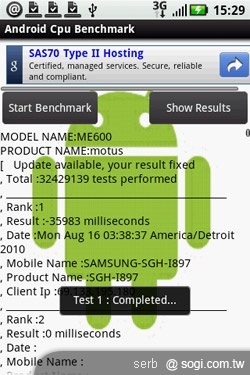 ▲Android CPU 測試。(左為 MOTO QUENCH MB501 ;右為 MOTO BACKFLIP ME600)