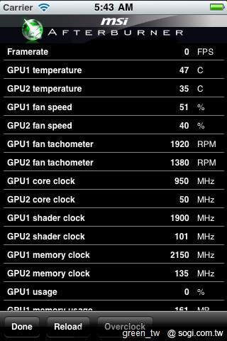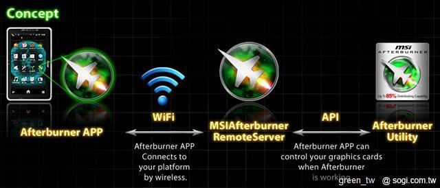 微星科技與知名程式設計師 Nick Connors 共同合作開發的 Afterburner APP,將微星獨家 Afterburner 超頻軟體向外延伸到手持行動裝置上,透過 Wi-Fi 連線,使用者就能隨時隨地監看核心溫度、頻率、記憶體時脈、風扇轉速等等的顯示卡相關資訊,提供更多樣且便利的使用體驗。