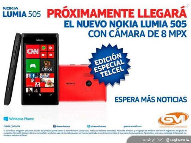 墨西哥運營商 Guerrero Móvil 上週透過 Facebook 發表了 NOKIA Lumia 510 的入門姐妹機 NOKIA Lumia 505(RM-923)的官方圖片,但僅透露該機將配備 800 萬畫素相機,其他規格並未透露。外媒 WPCentral 於 12/10 報導指出,NOKIA Lumia 505(RM-923)已經出現在墨西哥另一運營商 Telcel 的購機目錄中,並流出部份規格信息。據悉 NOKIA Lumia 505(RM-923)為 Telcel 獨家訂製機種,該網站預計在不久之後正式在墨西哥推出,至於售價尚未公佈。上述消息目前尚未得到 NOKIA 證實,手機王將繼續補充最新資訊。