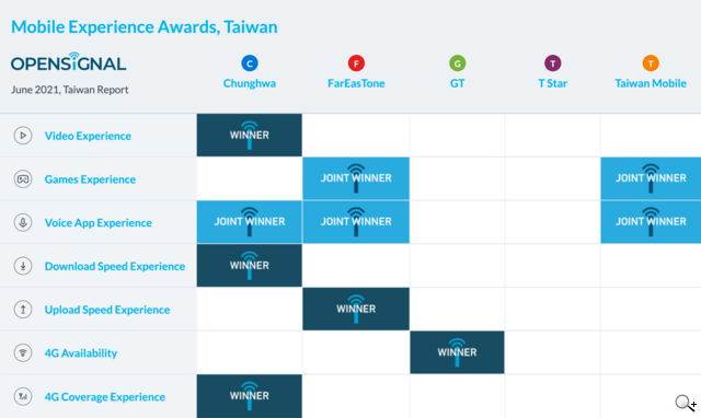 各別電信商 5G 行動體驗表現方面,「5G 可用性」遠傳與台灣大都有不錯表現;Opensignal 指出,「5G 可用性」代表用戶連結 5G 時耗費的時間,先前報告台灣大獨得此獎。不過這次遠傳大幅提升「5G 可用性」,雖然數字仍略遜台灣大,但兩家電信業者統計數字落在同區間(遠傳為 23.8%,台灣大為 25.3%),因此兩家業者並列第一。