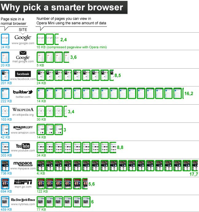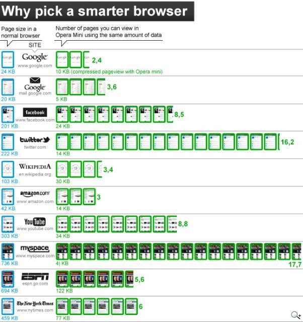 在最新公佈的手機上網報告(http://www.opera.com/smw/2011/06/ 英文版),Opera 整理了主流網站的數據流量,以及藉由 Opera Mini 瀏覽器可以額外瀏覽的頁數統計一欄表。