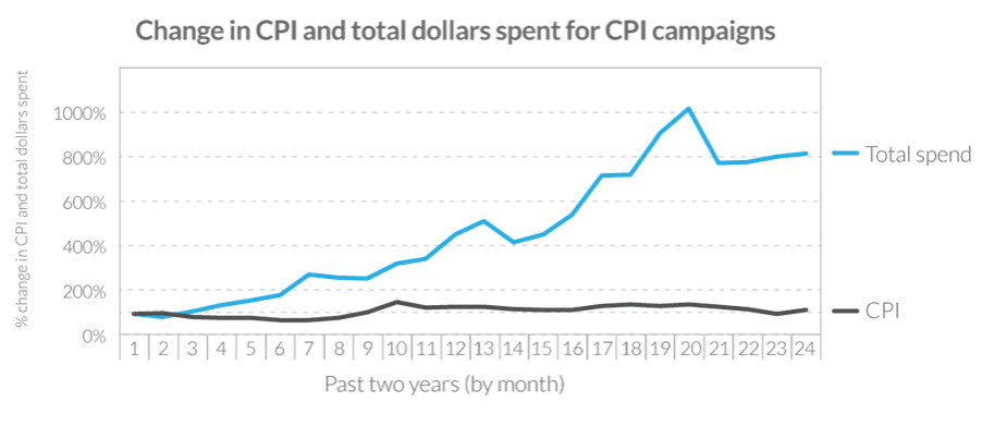 這類型的廣告活動花費在過去兩年呈爆發性成長,每次安裝成本 (CPI, cost-per-installation) 在 2014 年維持平穩,甚至開始出現減少的趨勢。