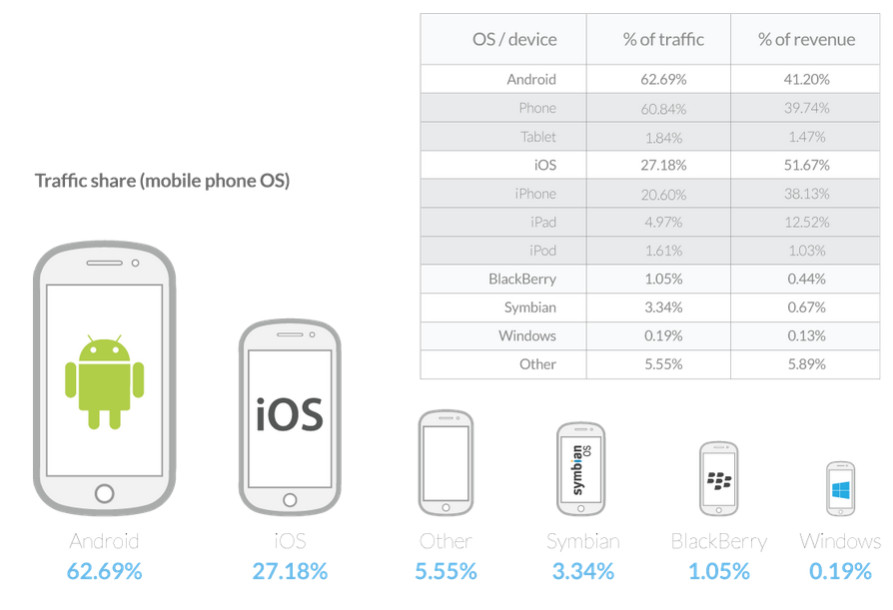 Apple 之所以在營收方面勝出,主要是靠西方市場的貢獻,例如美國、德國以及英國。這份報告也指出在這些市場,以高價值的富媒體與影音行動廣告形式最為常見。由於 iOS 在這些市場的佔有率較高,因此廣告的營收也最高,佔總營收 51% 以上。