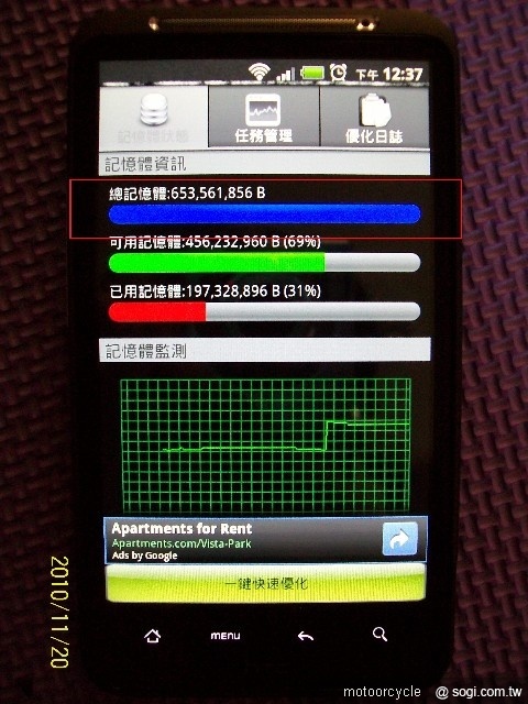前幾日拿到手機後,便去下載了"記憶體加速免費版"的軟體,打開一看發現軟體顯示的RAM容量好像跟官方數據768MB不符合,軟體顯示為623MB左右,請問各位高手也會這樣嗎?這是軟體的問題還是硬體的問題?煩請各位解惑一下,謝謝~~..........恕刪