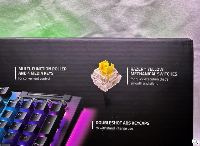 因為這把 RAZER BLACKWIDOW V4 PRO 是「Razer黃軸」,左上角的圖示可以讓玩家一目瞭然;另外特別標註有 多功能滾輪、8個專用巨集鍵、4個媒體鍵。
