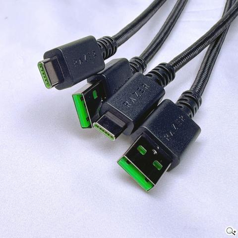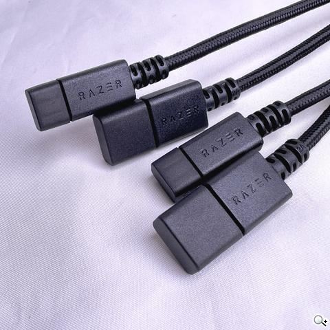 ▼ 雷蛇線材標準設計,兩端接頭都會有保護套,且線材上都會有 RAZER 字樣,取下保護套後,接頭當然是雷蛇標誌性的綠色。