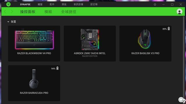 連接電腦的雷蛇產品,只要有支援 Razer Synapse,在軟體中都會顯示出產品圖示。(期待產品可以愈來愈多)