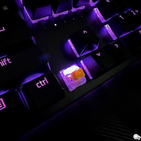 ▼ Razer 機械軸 有高達 10,000萬次敲擊壽命,透明的按鍵軸套 可以看到 LED透鏡 投射出來的集中光源。