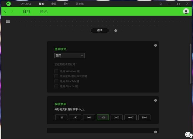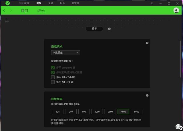 ▼ fn+F10 可以開啟遊戲模式,可以設定 遊戲時 常用的禁用鍵;取樣頻率 最高可達 8000Hz,筆者自己設定到 2000Hz 就覺得很夠了。