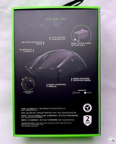 ▼ 盒裝背面同樣列出 RAZER VIPER V2 PRO 特色,產品有著兩年保固,右上角特別圖示出 第三代RAZER光學滑鼠按鍵軸。