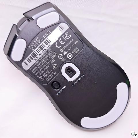 ▼ RAZER VIPER V2 PRO 底部 除了一堆認證及硬體規格外,上方兩邊及下方一小塊有PTFE白色鼠腳,按鍵為 開關/DPI 控制按鈕,中央則是擁有 30K DPI 光學感測器。