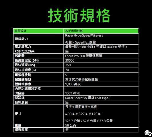 ▼ 下方圖示三個特色 - 超輕量58克、第三代RAZER光學滑鼠按鍵軸、RAZER FOCUS PRO 30K 光學感測器。