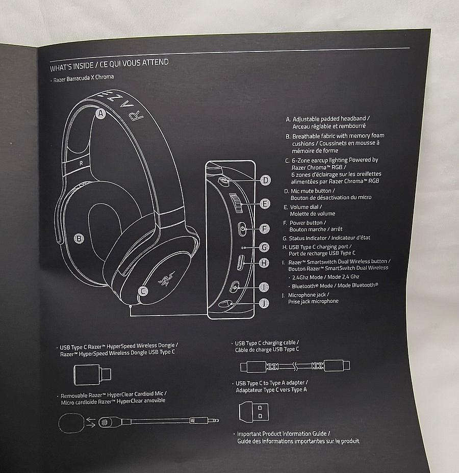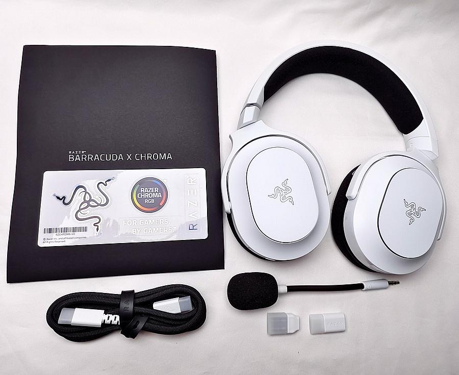▼ 內容物 - Razer Barracuda X Chroma 本體、說明書、信仰貼紙、可拆式 Razer HyperClear 心形指向麥克風、USB-C 充電連接線、Type C Razer HyperSpeed Wireless Dongle、USB-A 公對 USB-C 母轉接器。