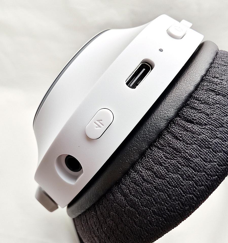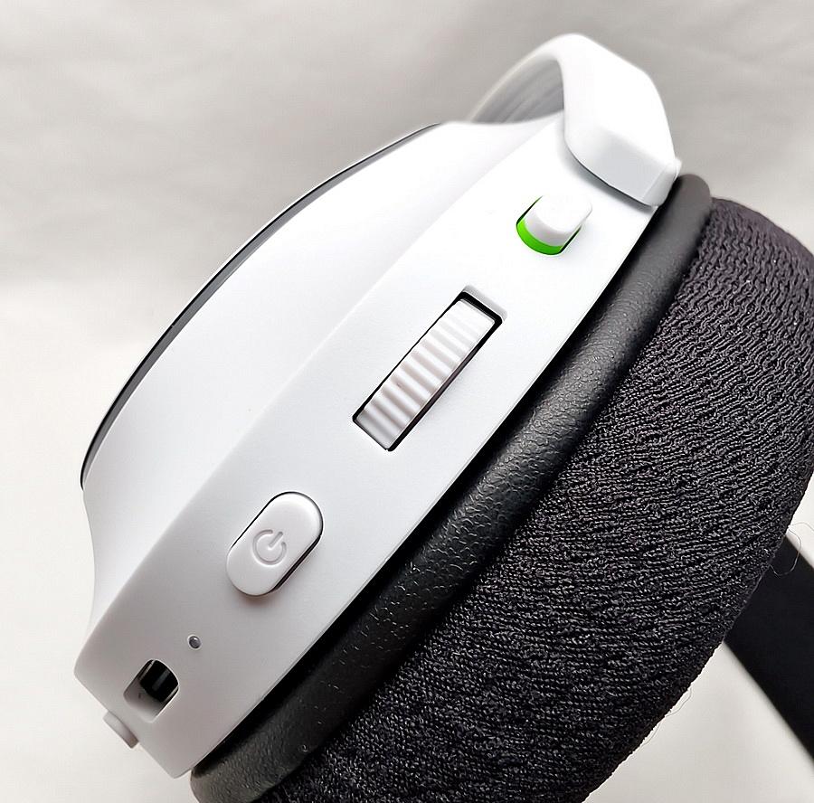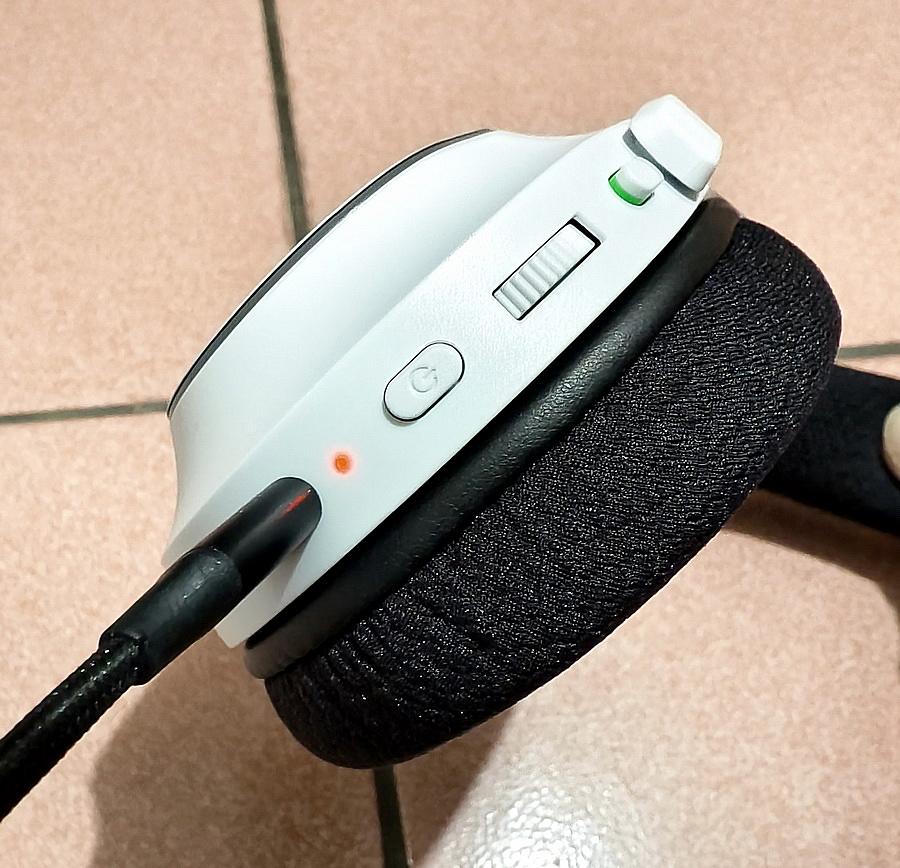 ▼ Razer Barracuda X Chroma 的按鍵皆設計在左邊 - 麥克風靜音、音量調整轉盤、電源開關鍵、指示燈、USB-C 連接埠、SmartSwitch 切換按鍵,以及 3.5mm 麥克風音源插孔。