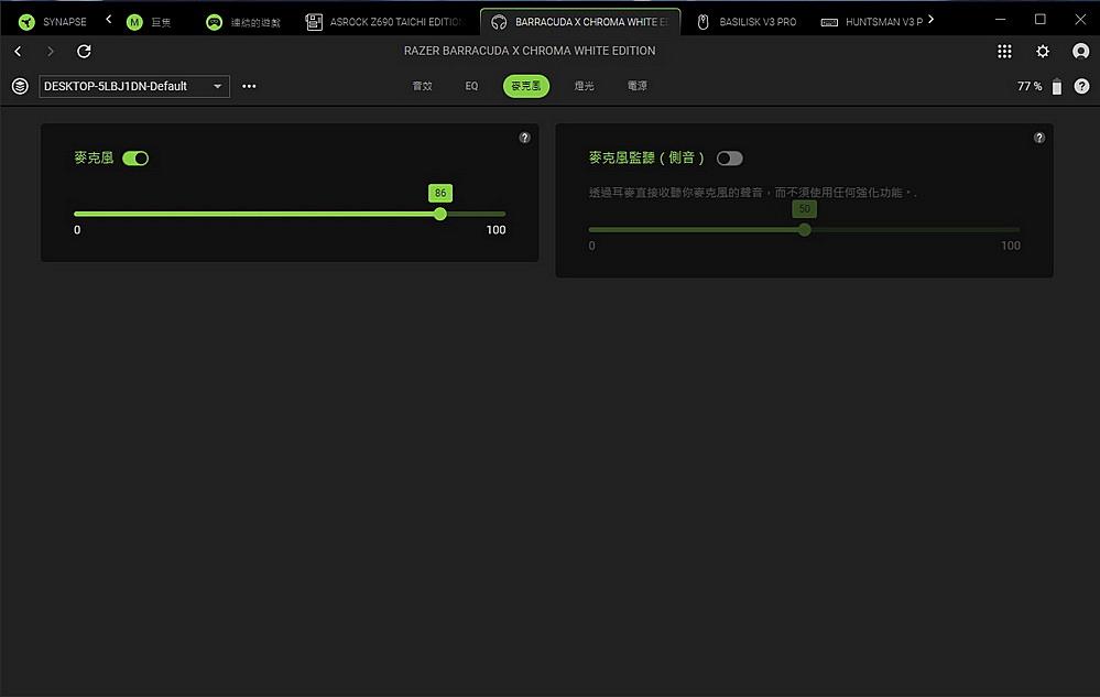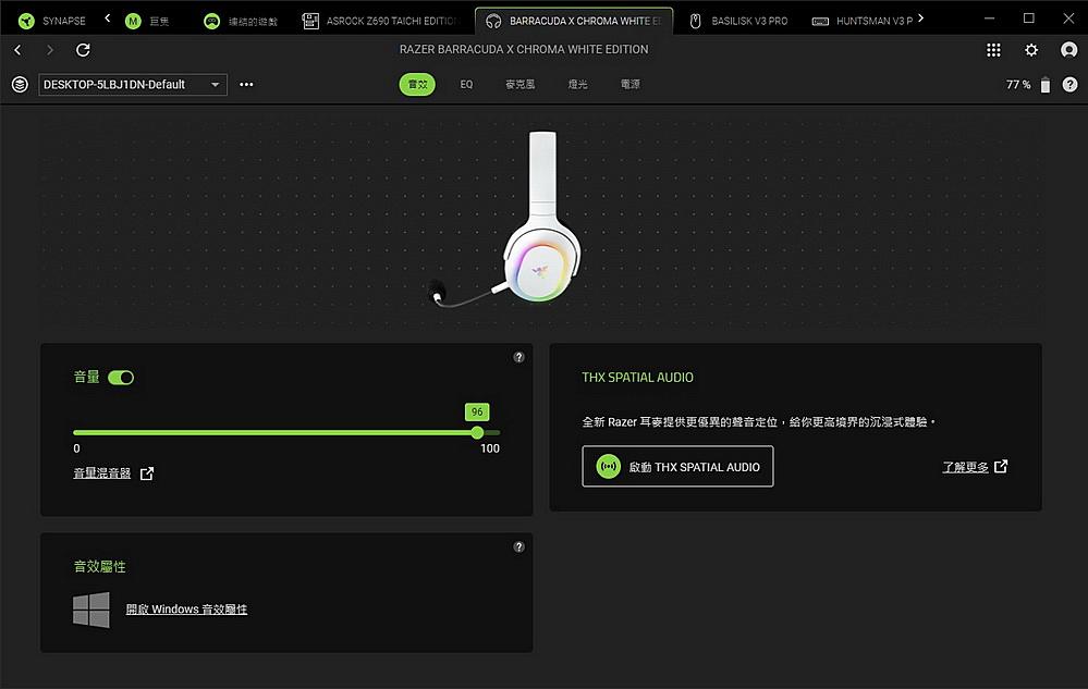 ▼ 點擊 Razer Barracuda X Chroma,可以看到 音量開關及控制,如果有購買 THX Spatial Audio 應用程式,可以開啟該程式來達到 7.1 聲道的環繞。