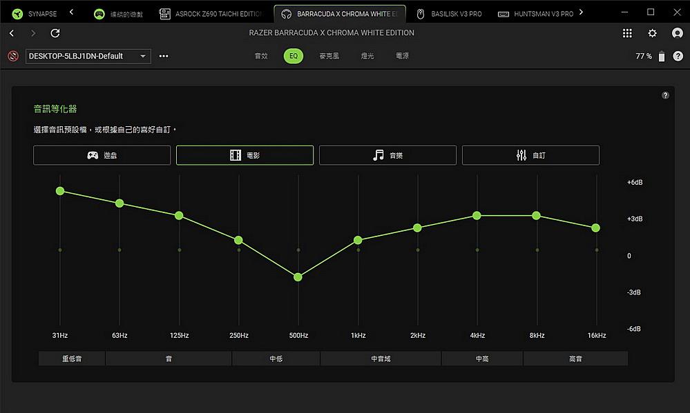 筆者也有用 Razer Barracuda X Chroma 來追劇及聽音樂,其人聲細節的呈現尤其優異,低音的表現則較不足,不過每個人對於聲音的感覺不同,只要透過 EQ 自訂 就可以調整自己喜歡的音效。