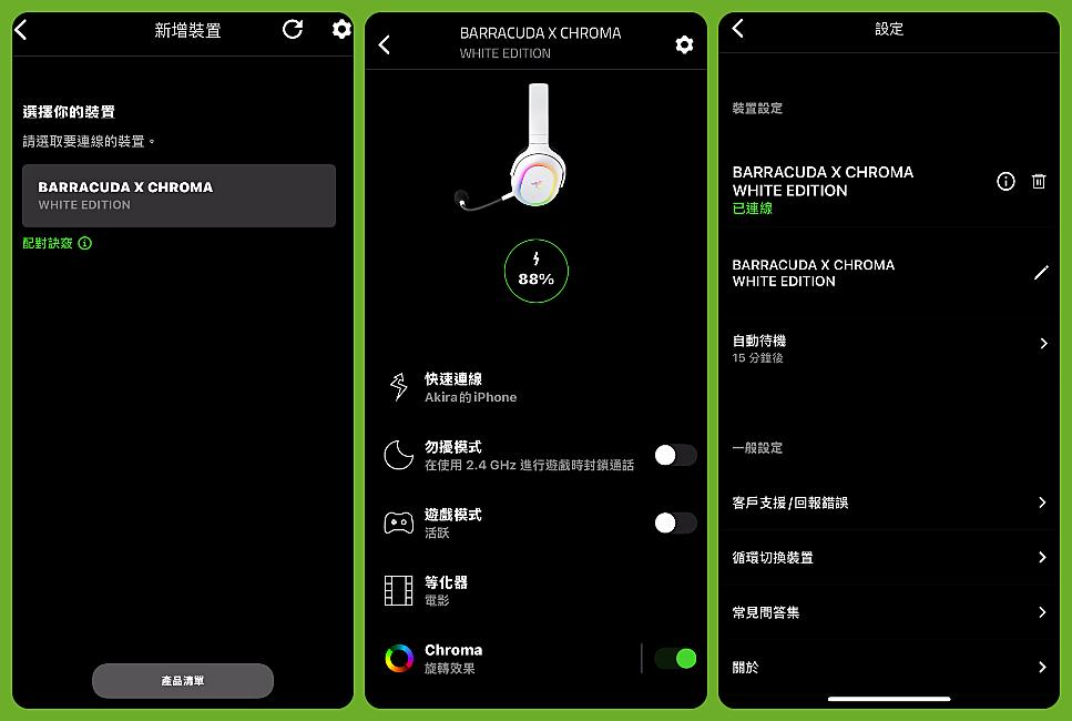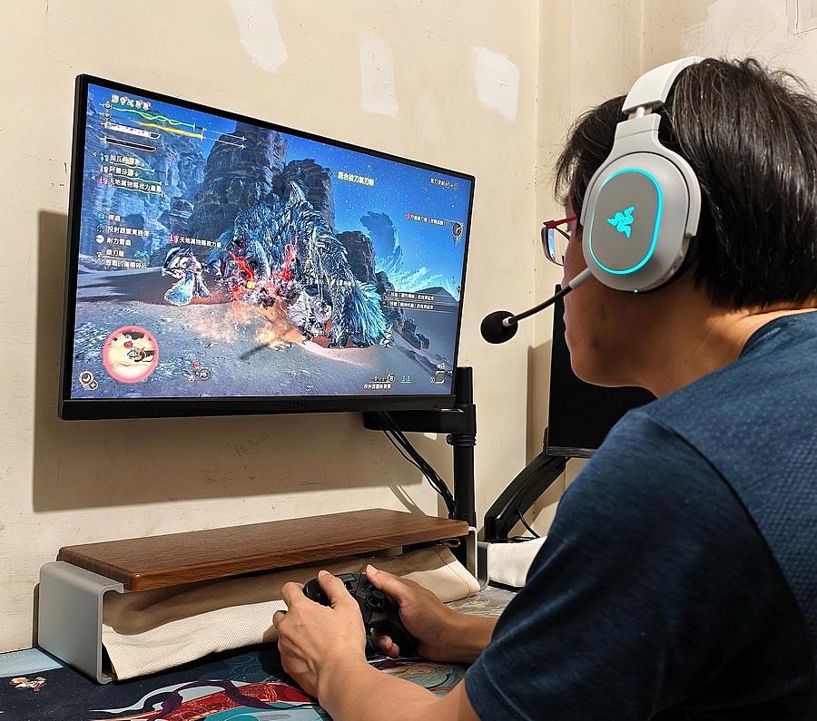 一個多星期來都戴著這次要開箱的 Razer Barracuda X Chroma 來玩《魔物獵人:荒野》,其搭載 Razer TriForce 40 mm 驅動單體,更完美的呈現全音域;可拆卸式 Razer HyperClear 心形指向麥克風,收音非常清晰;6區耳罩燈光效果,可以自訂炫麗的RGB燈效;搭載 Razer SmartSwitch Dual Wireless,可同時連接 2.4GHz 和 藍牙裝置,可支援多樣化平台,並具備智慧切換功能;還有最長達約 70小時 續航力。