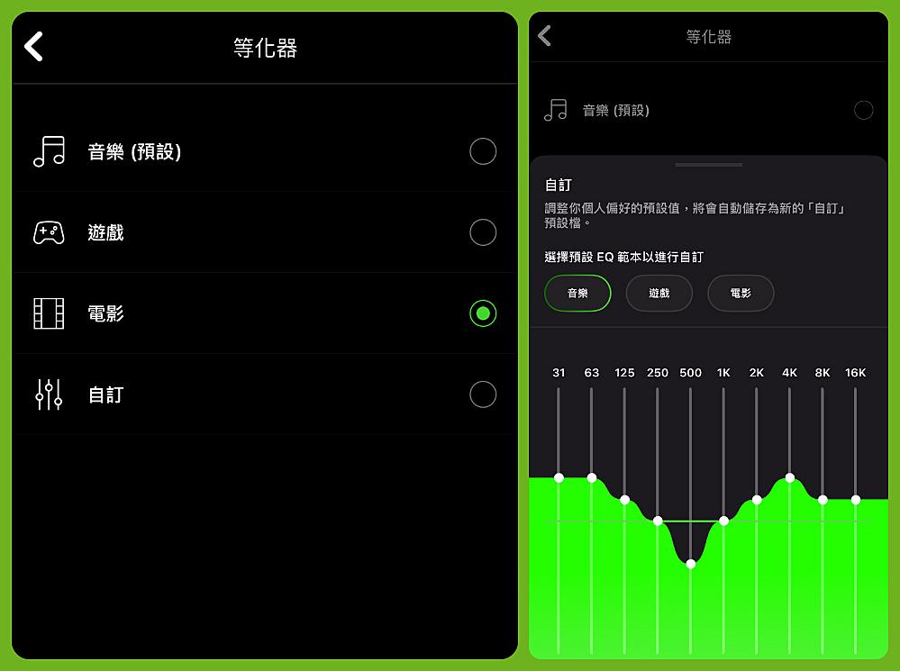 ▼ 等化器 有著 音樂、遊戲、電影與自訂 四種模式。