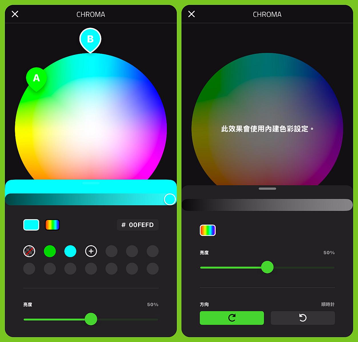 ▼ Chroma 有四種燈效可以設定 - 呼吸效果、光譜循環、定色光、旋轉效果。