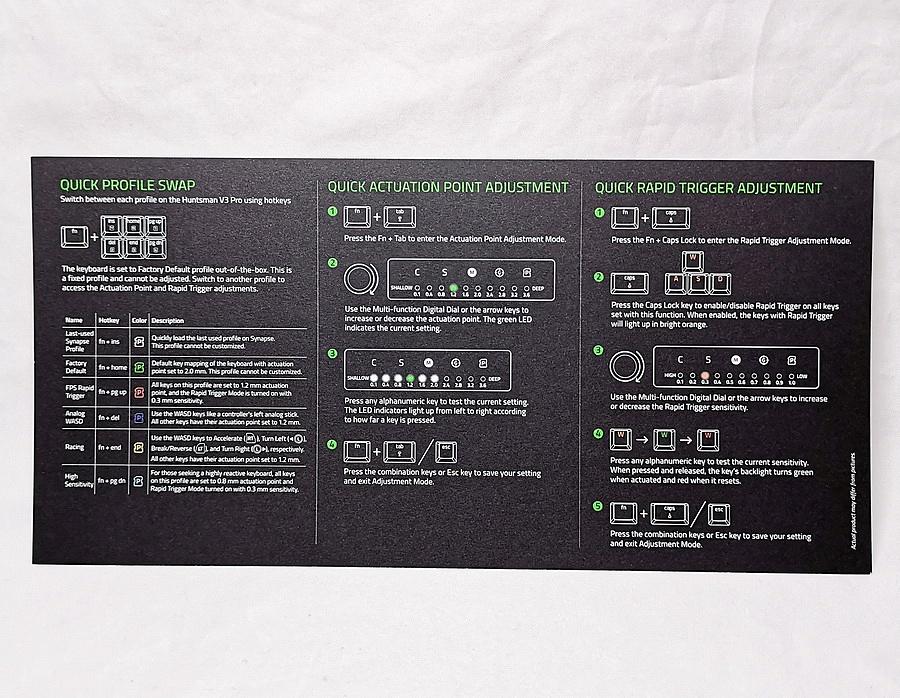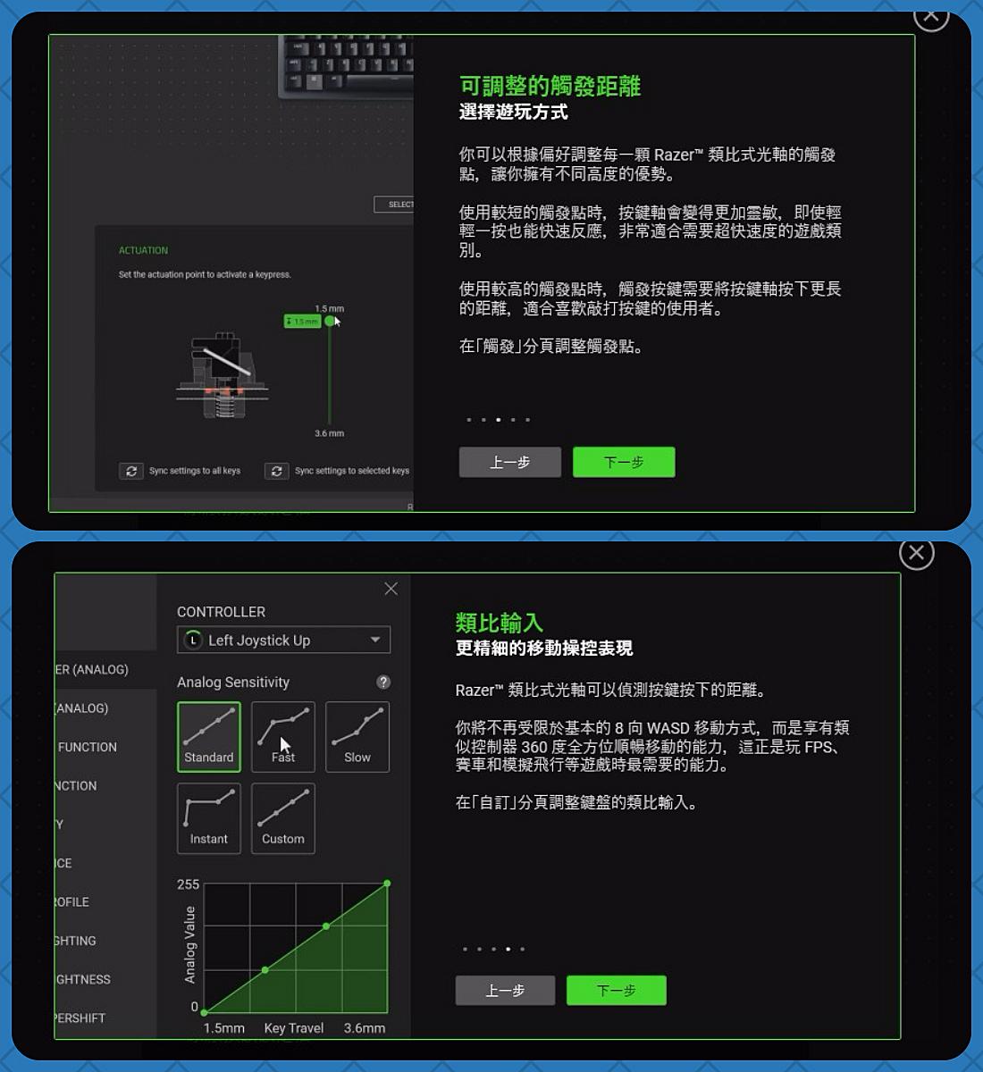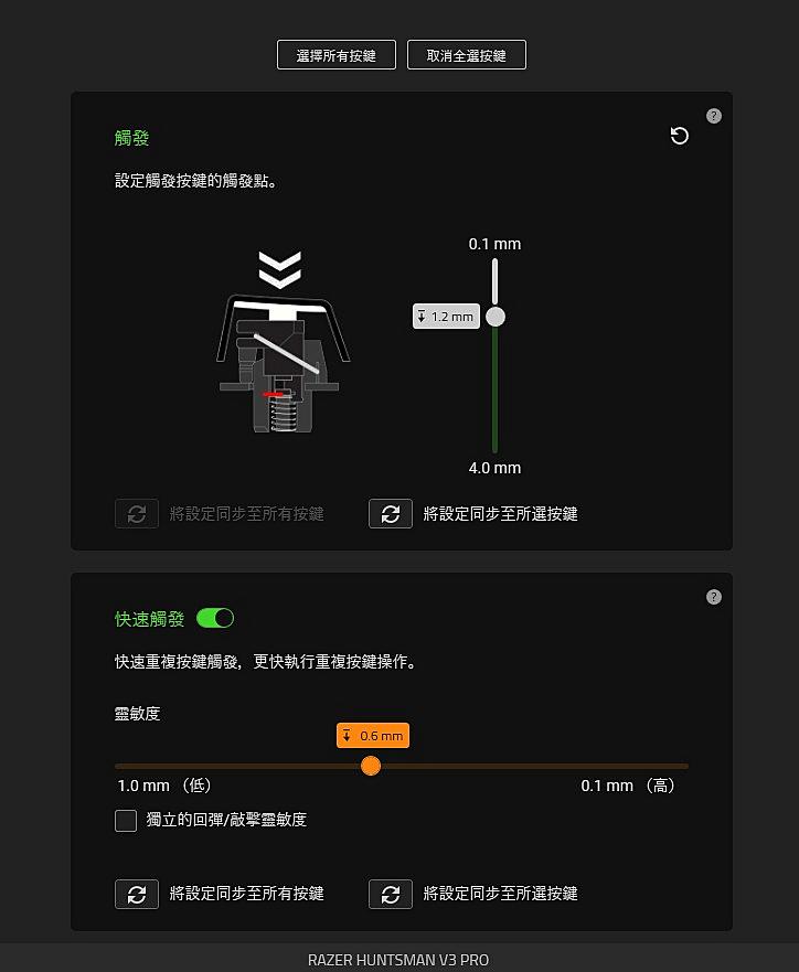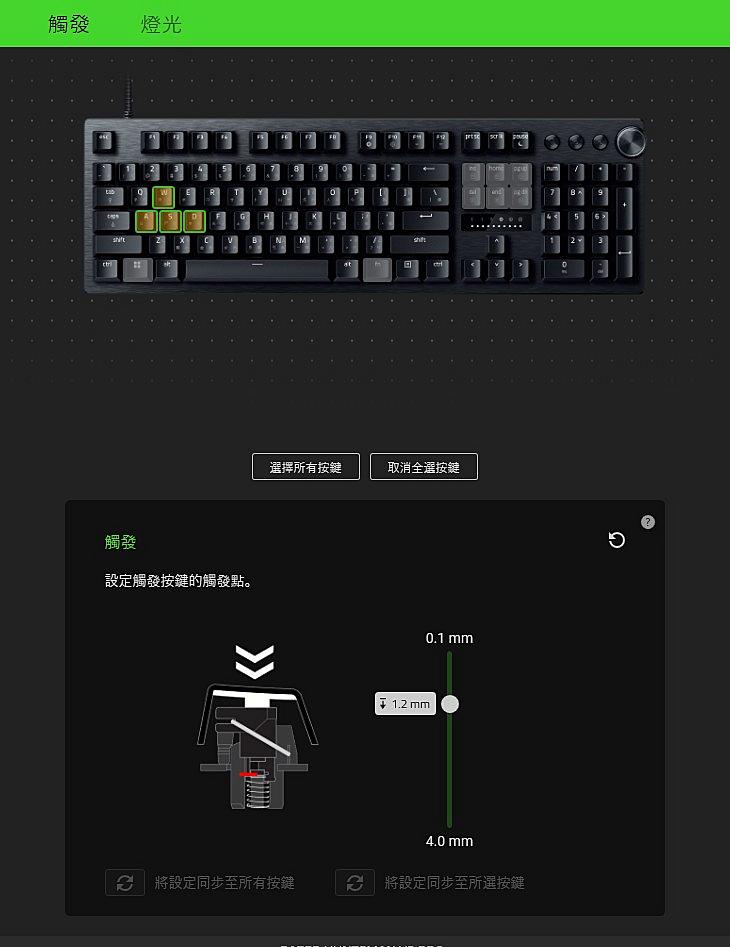 這段時間使用 Razer Huntsman V3 Pro 之後,已經漸漸上手其觸發設定,針對幾款不同遊戲都各自設定了設定值,在不用開啟軟體的狀況下,使用組合鍵就可直接切換實在是非常方便。