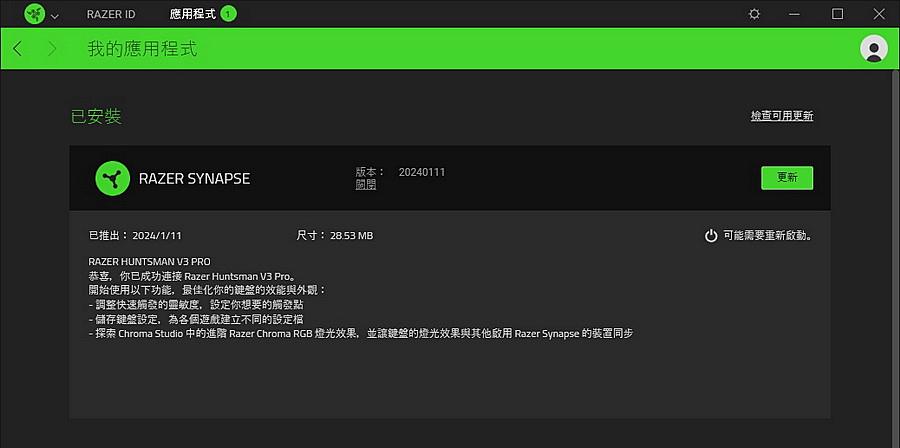 ▼ 接上電腦後,Razer Synapse 立馬跳出更新通知,更新完也不意外的要重新開機。