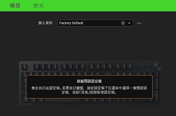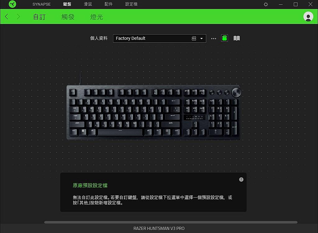 ▼ Razer Synapse 軟體介面中選擇 Razer Huntsman V3 Pro,可以看到提示在 原廠預設設定檔 的話,無法自訂鍵盤的所有按鍵。