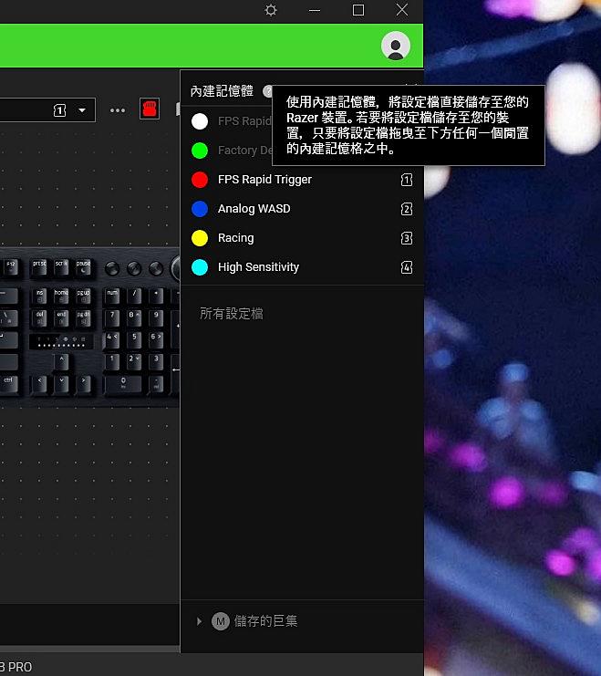 ▼ Razer Synapse 軟體介面中,每個設定檔都會呈現不同的顏色。
