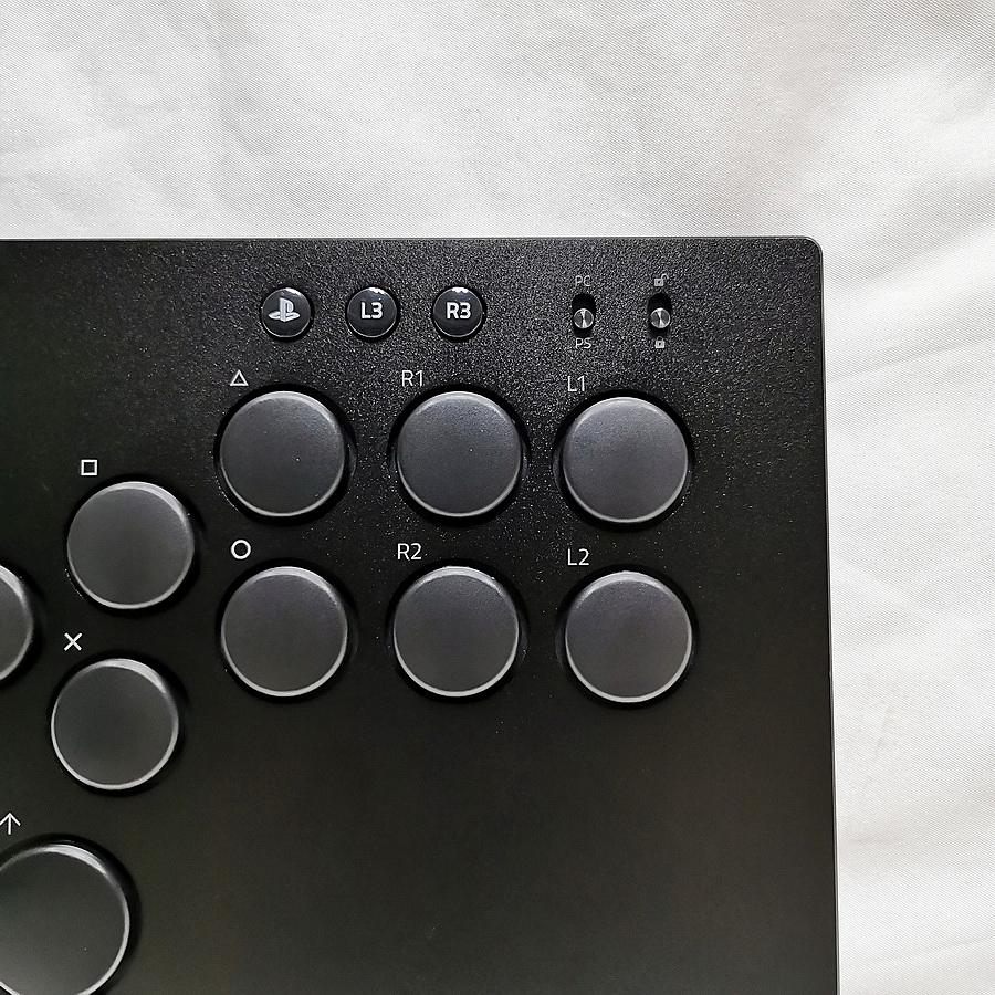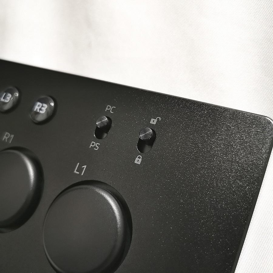 ▼ 右上方 PS鍵、L3鍵、R3鍵,另外還有 PC/PS 模式切換開關、電競鎖定開關(可停用「非必要按鈕」)。