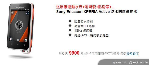 Sony Ericsson Xperia active ST17i 參考建議售價:NT$9,900 元。