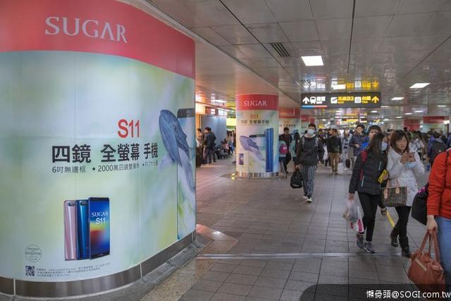 前不久,剛剛結束新機S11發佈會的SUGAR糖果手機,近日鎖定人潮密集的北捷展開銀彈攻勢。巨幅新品海報出現在臺北車站最重要動線區域,沿途包柱版面連續拓展到捷運板南與淡水信義線轉乘、及高鐵與台鐵出入口。高曝光度的場景顯得吸睛十足,吸引不少乘客沿路驚歎。