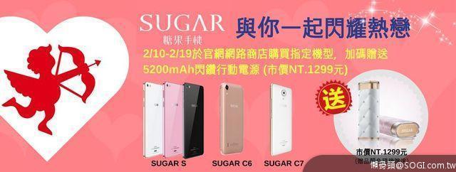 於2/10-2/19之活動期間,購買指定機型SUGAR S / C6 / C7,即贈5200 mAh閃鑽行動電源(市價 NT.1,299元)。