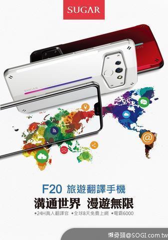 SUGAR F20一機抵多機的旅遊神器,大大減輕包包的重量,出國旅遊從此輕鬆無負擔。4月21日起於電商PChome與MOMO購物網開賣,單機售價9,900元,4月21日至5月5日早鳥購機好禮享不完,購機即送限量「超商千元禮物卡」,更享有2大獨家好禮「全球8天免費上網」與「24H真人翻譯免費體驗」!了解更多SUGAR F20專屬功能請造訪SUGAR官網。