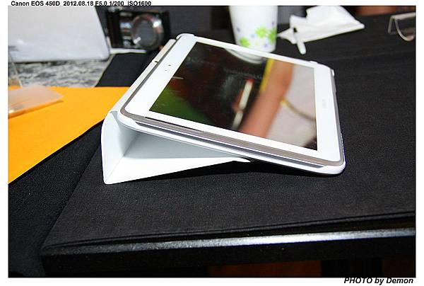其實是三種擺放的方式,在皮套的中段有一條可以吸磁鐵的地方,將皮套蓋末端磁鐵吸上去就好了
