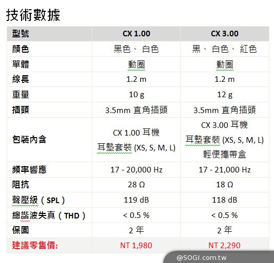 為了降低外界噪音干擾,所有 CX 系列耳機都配有 4 種尺寸耳套,用家可自行選擇合適自己的耳墊,讓您在嘈雜環境中也能確保絕佳的聆聽體驗。CX 3.00 系列耳機還配有硬殼耳機盒,方便用家收納儲存。