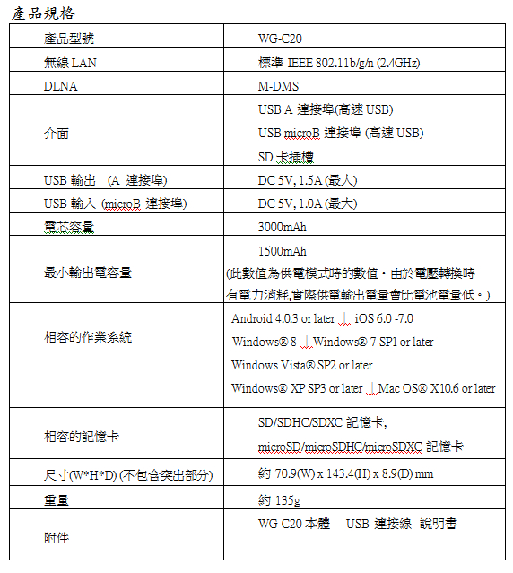 【WG-C20】透過 Wi-Fi 與 NFC 一觸即控功能,可提供智慧型手機與 SD 記憶卡方便快速的資料傳輸,更能同時提供 8 個裝置存取,無論是聚會分享最新影音照片檔案或是會議資料參考,都更加方便有效率!輕薄時尚外型兼具 3000mAh 容量行動電源功能,透過 USB 連接線可供智慧型手機、平板電腦或數位相機即時充電,成為行動管理資料最完美的雙效首選配備。Sony 行動無線讀卡機【WG-C20】同時支援 DLNA,可輕鬆串連播放資料於家庭音響、電視或藍光撥放器等娛樂設備,打造完善並且隨心所欲的居家數位影音享受。